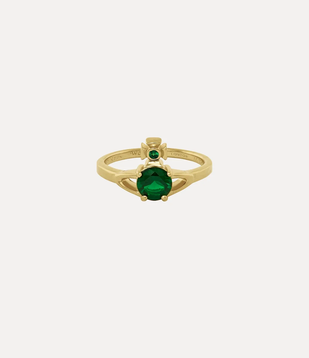 Unser Reina Petite Ring ist aus recyceltem Silber gefertigt und mit einem glänzenden goldfarbenen Finish und grünen Kristallverzierungen versehen. Das Stück verfügt über eine kugelförmige Vorderseite, die für Tradition steht, umgeben von den himmlischen Ringen des Saturn, die die Zukunft symbolisieren.
