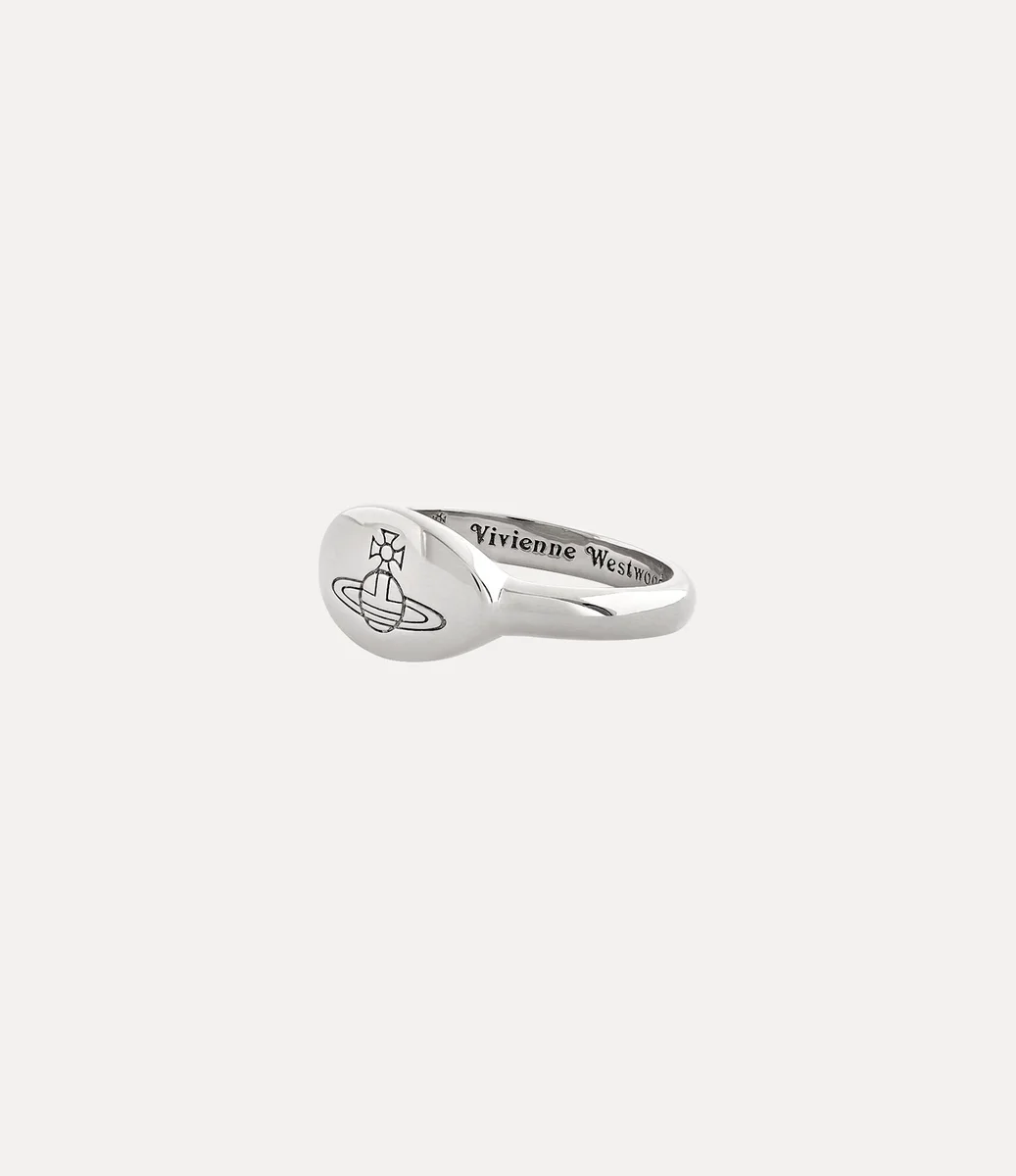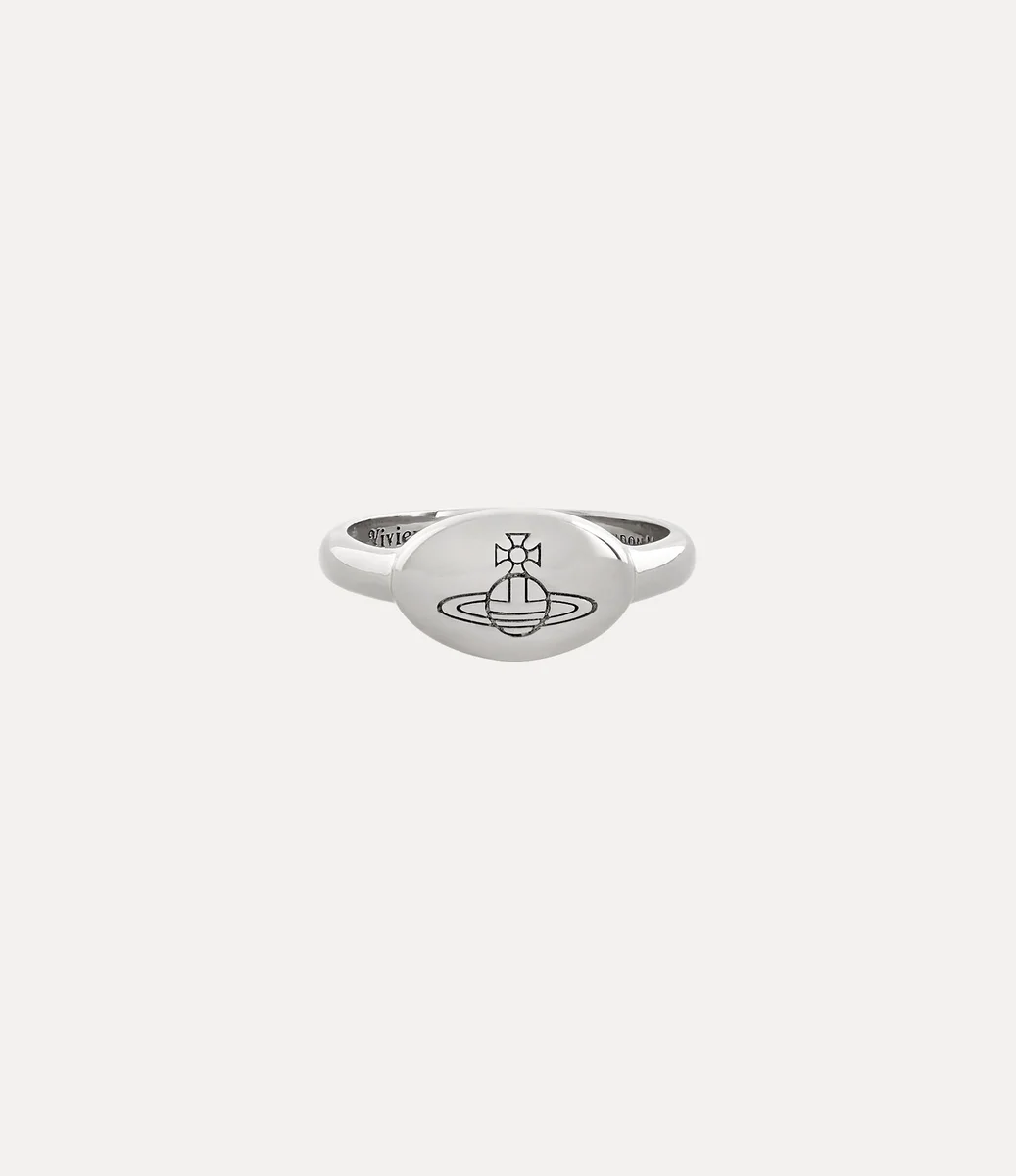 Unser Tilly-Ring zeichnet sich durch eine klassische Siegelring-Silhouette aus, die durch ein Finish aus recyceltem Silber und eine platinfarbene Beschichtung ergänzt wird. Dieses Schmuckstück ist mit einer ovalen Fläche verziert, auf der unser charakteristisches Kugelmotiv eingraviert ist, das mit Patina veredelt wurde, um das Gesamtdesign aufzuwerten – eine Anspielung auf Viviennes Vision, Tradition in die Zukunft zu tragen.