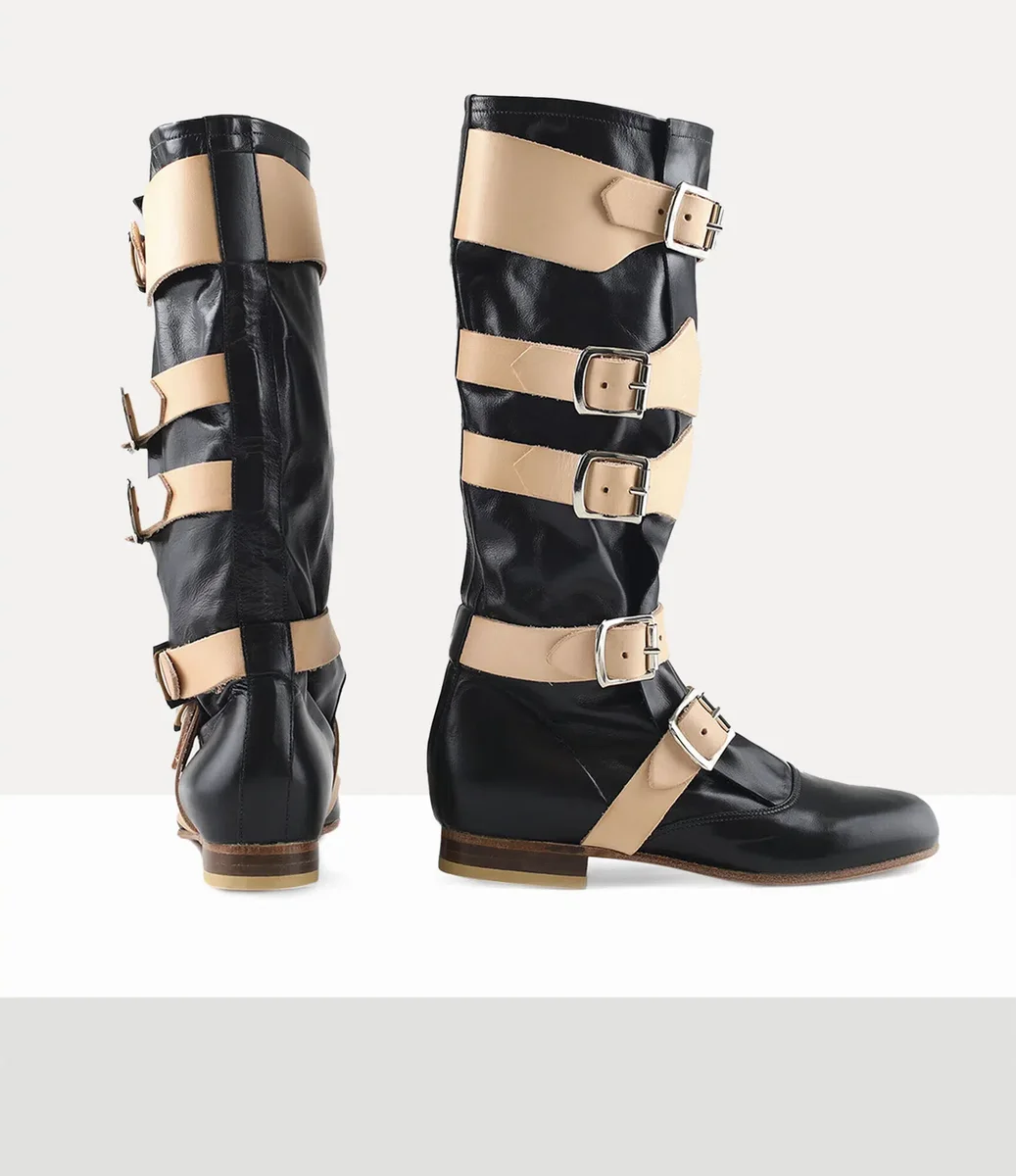 Unsere Piratenstiefel wurden erstmals in der Herbst/Winter-Kollektion 1981 „Pirate” vorgestellt, die von Viviennes Interesse an abenteuerlichen Piratengeschichten aus dem 17. und 18. Jahrhundert beeinflusst war. Das Design fängt die Essenz der Romantik und Rebellion ein, die oft mit Piraten in Verbindung gebracht wird, mit einem umwickelten, weichen, locker sitzenden Lederschaft und schweren Lederriemen mit Rollschnallen, die den Stiefeln ein robustes, abgenutztes Aussehen verleihen.