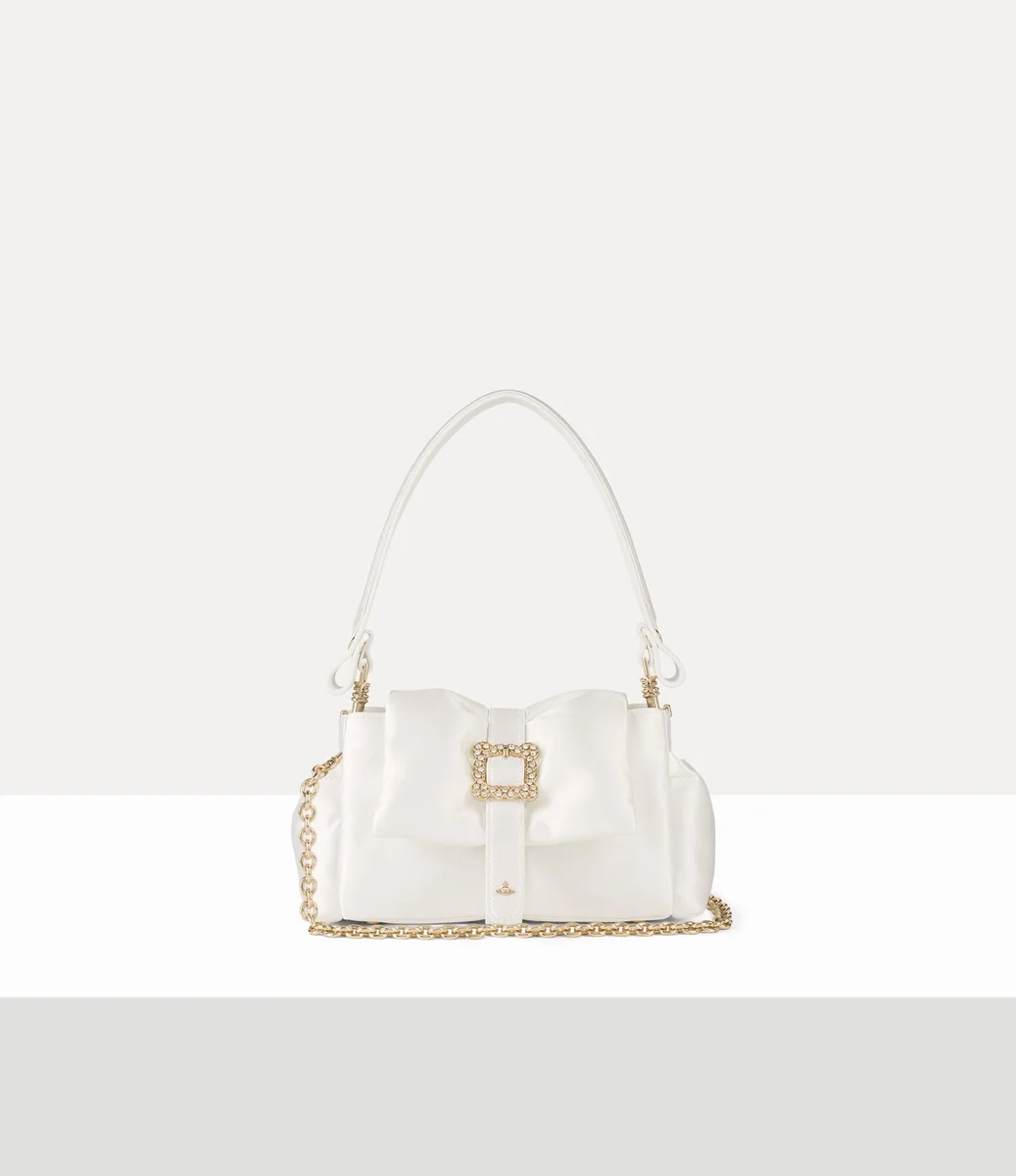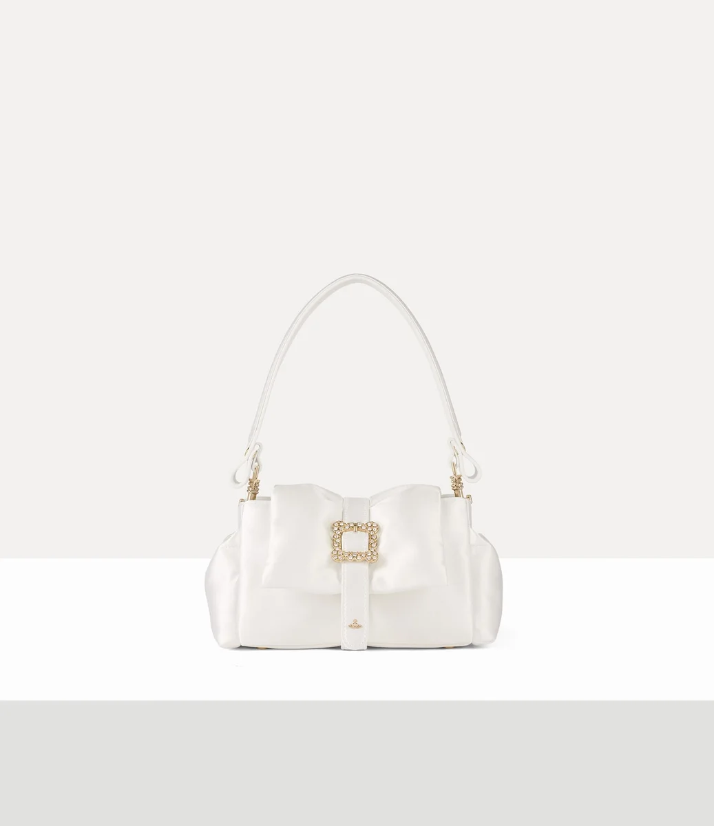 Unsere Hazel Mini Treasure Handtasche ist aus einer Seidenmischung gefertigt und verfügt über einen oberen Griff, unser charakteristisches pastellblaues Futter und polierte Metallbeschläge. Ein skulpturaler Gürtel umschließt die weiche Silhouette, verziert mit einem dekorativen Kugelanhänger und einer opulenten, mit Kristallen besetzten Rahmenschnalle, die an Viviennes Verehrung für die Kunstgeschichte erinnert.p>