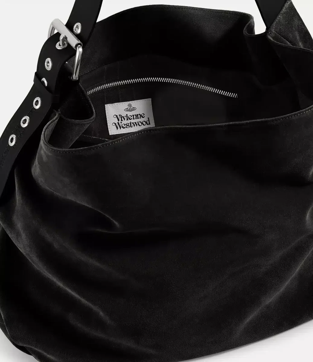 Unsere große Umhängetasche Maxime besteht aus Wildleder und verfügt über einen gravierten Rollverschluss sowie eine Reihe silberfarbener Ösen entlang des Schulterriemens, die an das Design des ikonischen Alex-Gürtels des Hauses erinnern. Das Modell ist mit einem Magnetverschluss versehen und verfügt über eine Innentasche mit Reißverschluss.