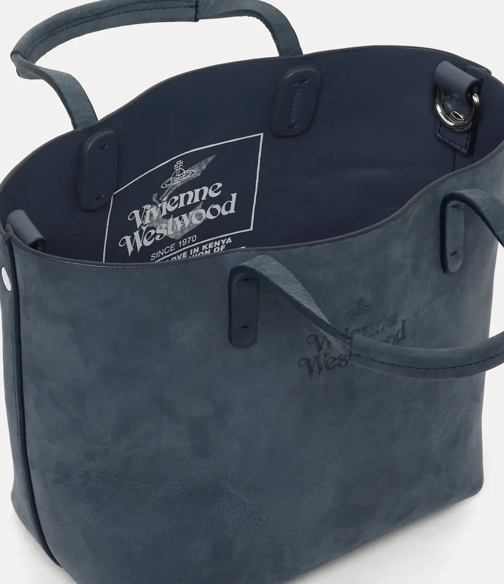 Die kleine Einkaufstasche von Vivienne Westwood Studio ist aus weichem, denimblauem Nubukleder gefertigt und verfügt über eine geprägte Vorderseite.