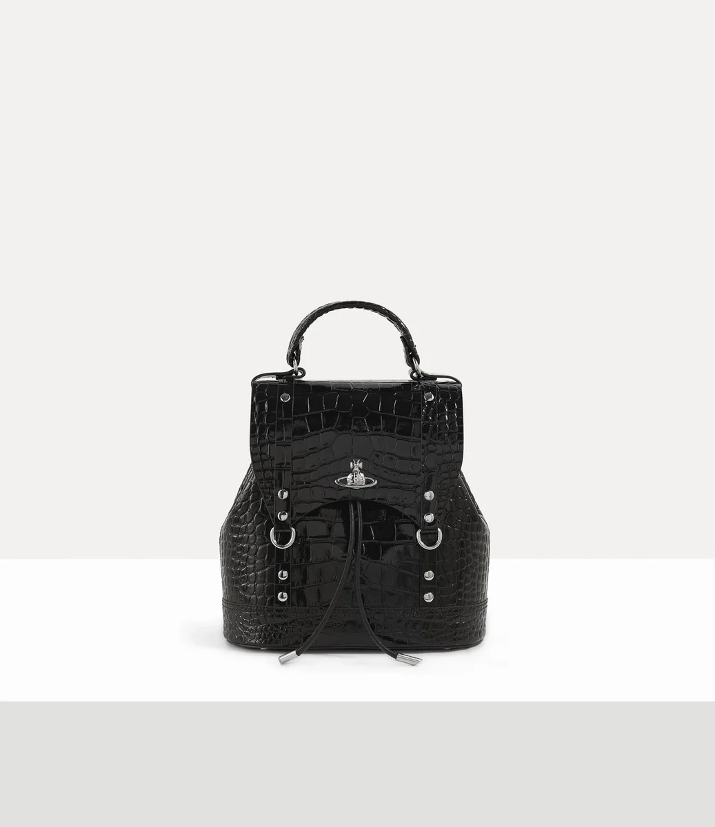Der Vivienne Westwood Max Small Rucksack ist aus Leder mit Krokodilprägung und Lackstruktur gefertigt.