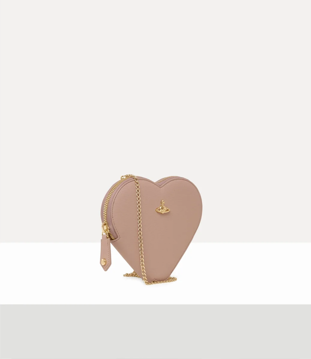 Die New Heart Crossbody Tasche hat eine herzförmige Silhouette, die an Viviennes Zuneigung zur Menschheit und zum Planeten erinnert. Das Modell verfügt über ein hellgoldenes Orb-Motiv auf der Vorderseite, das Tradition symbolisiert und von den himmlischen Ringen des Saturn umgeben ist, die für die Zukunft stehen.