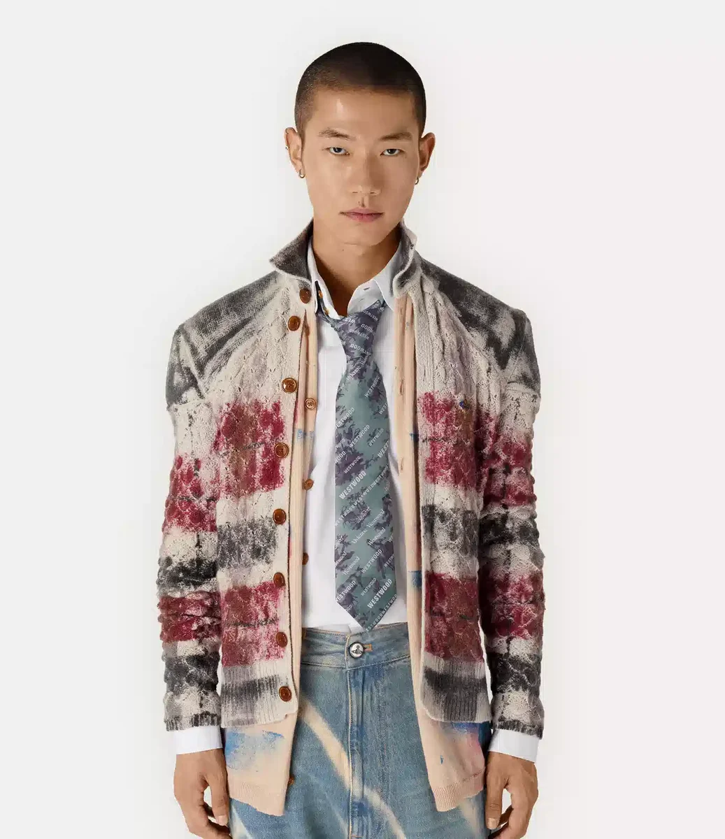 Die Krawatte von Vivienne Westwood ist mit einem Toile-de-Jouy-Print und einem breiten, sich zu einer spitzen Spitze verjüngenden Kragen versehen und mit dem auffälligen Schriftzug „Westwood” verziert.