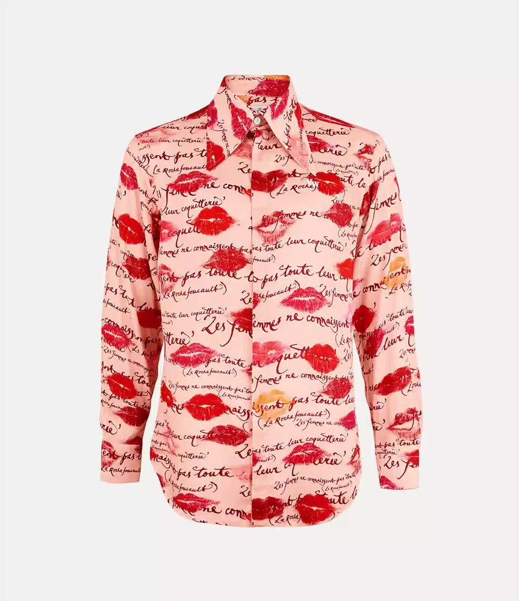 Das Tuxedo-Hemd von Vivienne Westwood verfügt über einen übertrieben spitzen Kragen, der mit dem „Kisses”-Motiv verziert ist, das von der Verpackung unseres Parfums „Boudoir” inspiriert ist.