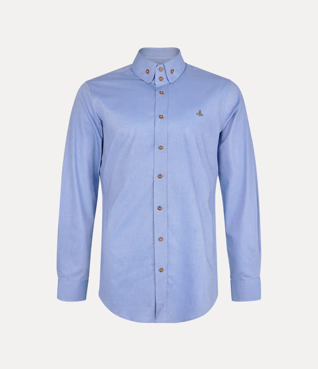 Das Two Button Krall Shirt zeichnet sich durch Viviennes Zwei-Knopf-Ausschnitt und den abgerundeten Kragen aus, ergänzt durch einen sanft abgerundeten Saum. Das langärmelige Design verfügt über eine gestickte Kugel, die Tradition symbolisiert, umgeben von den himmlischen Ringen des Saturn, die die Zukunft symbolisieren.
