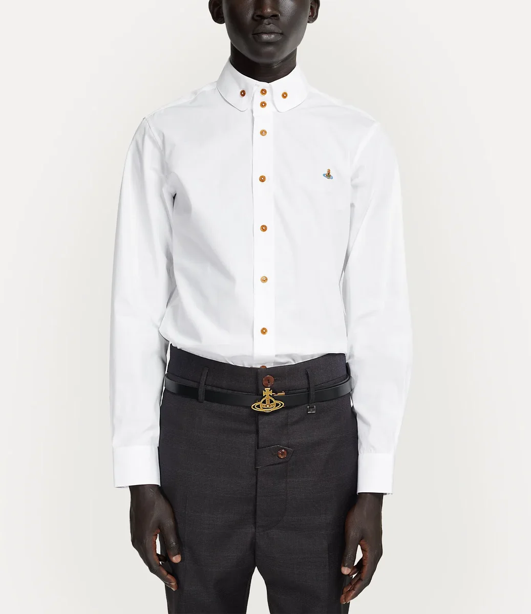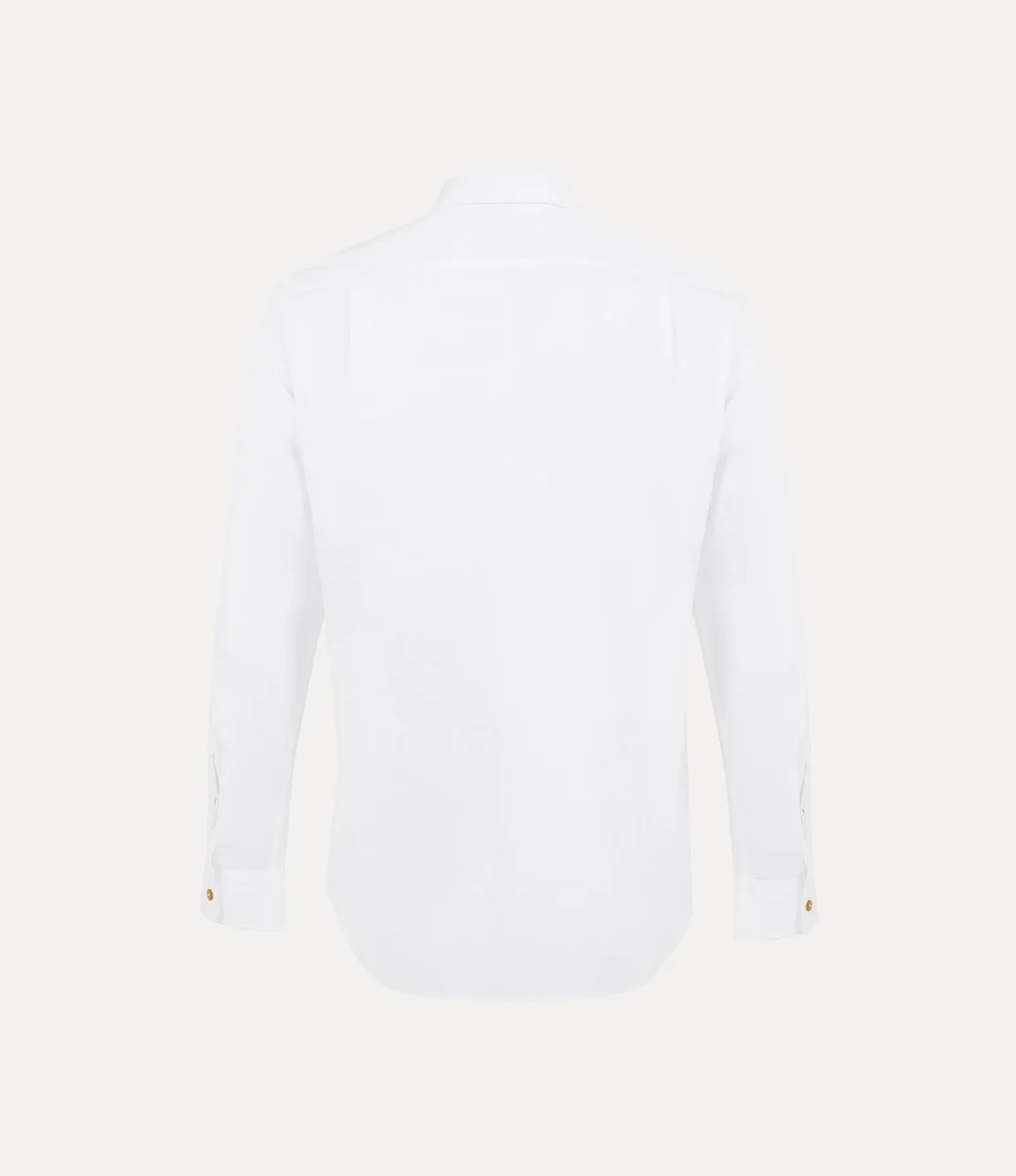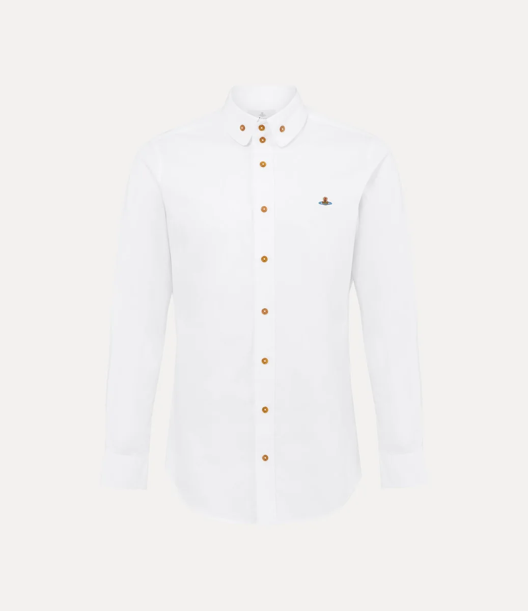 Das Two Button Krall Shirt dieser Saison ist von einem Archivdesign inspiriert und verfügt über den charakteristischen Zwei-Knopf-Kragen des Hauses. Das Kleidungsstück ist auf der Vorderseite mit unserer charakteristischen Orb-Stickerei verziert, die Viviennes Vision symbolisiert, Tradition in die Zukunft zu tragen.