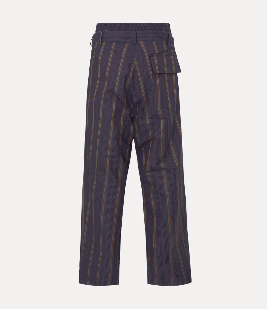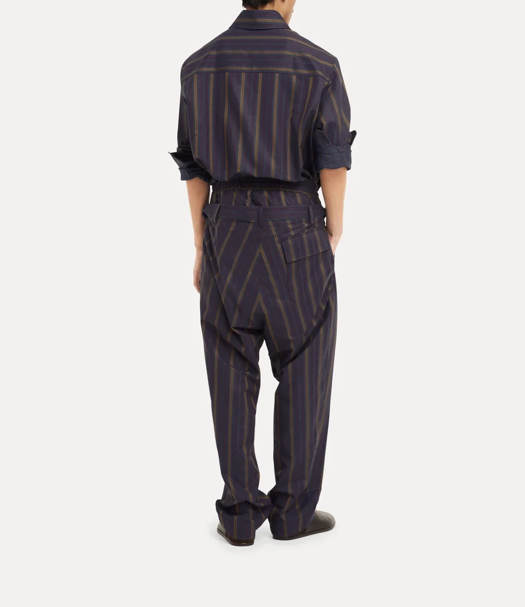 Unsere Builder-Hose kehrt in dieser Saison in einem gestreiften Baumwoll-Finish zurück, verziert mit einer gestickten Kugel an der Hüfte. Das Design mit seinem markanten doppelten Bund basiert auf Viviennes experimentellem „Builder”-Schnittsystem, das erstmals in der Herbst/Winter-Kollektion 2014/15 „Save the Rainforest” vorgestellt wurde.