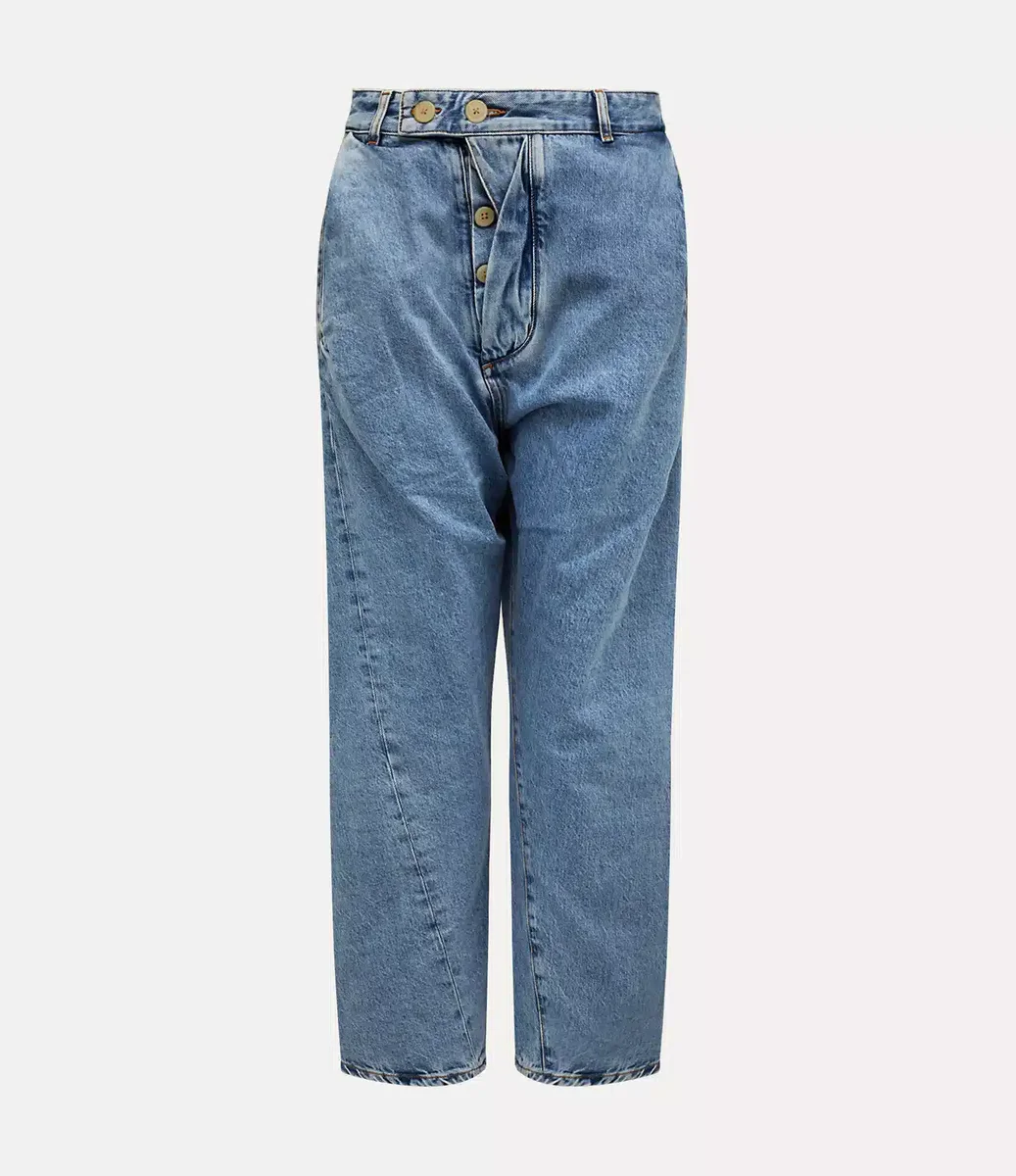 Die Worlds End Drunken Hose in heller Denim-Waschung verfügt über das charakteristische Drunken-System des Hauses, das sich an der traditionellen britischen Schneiderei orientiert und einen verdrehten, schrägen Schnitt aufweist. Die Hose zeichnet sich durch einen asymmetrischen Verschluss vorne aus, der einen verzerrten, drapierten Effekt erzeugt, der die Punk-Ästhetik des Hauses verkörpert.p>