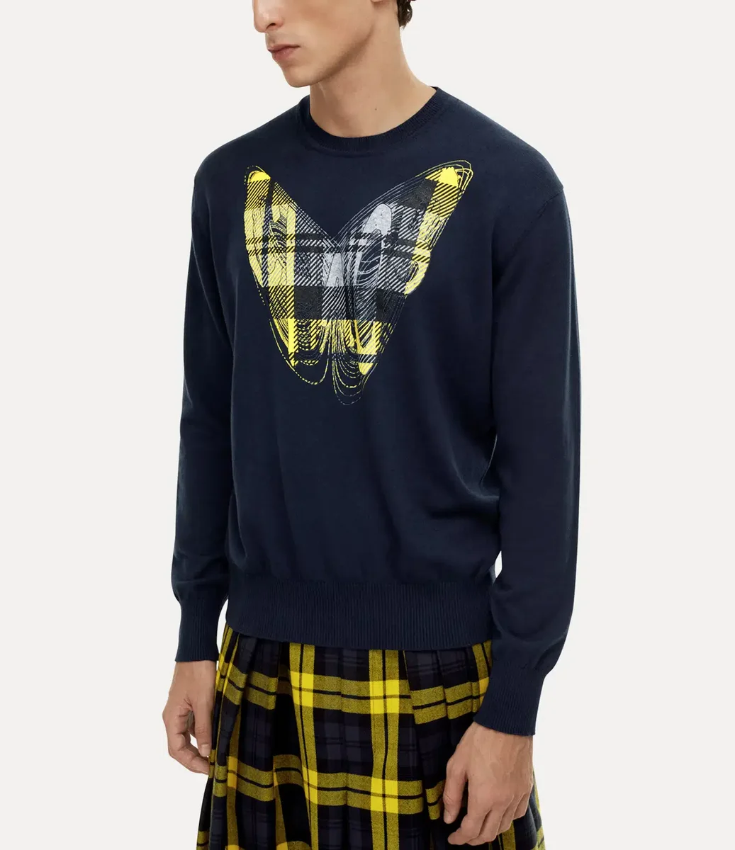 Der Chaos-Pullover zeigt in der Mitte ein Schmetterlingsmotiv, das die charakteristische Symbolik des Hauses würdigt, und ist mit dem lebhaften Tartan-Kunstwerk „Chaos” dieser Saison bedruckt. Das Modell hat einen klassischen Rundhalsausschnitt, lange Ärmel und einen geraden Saum, der mit raffinierten Rippbündchen abgeschlossen ist.