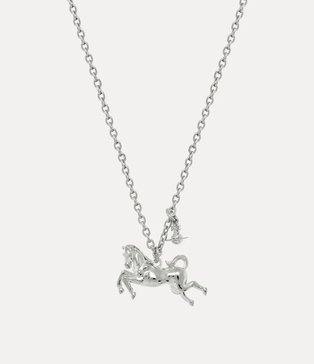 Vivienne Westwood Man. Cheval Anhänger-Halskette aus recyceltem Silber mit dem Pferdemotiv dieser Saison, aufgehängt an einer zarten platinbeschichteten Kette.