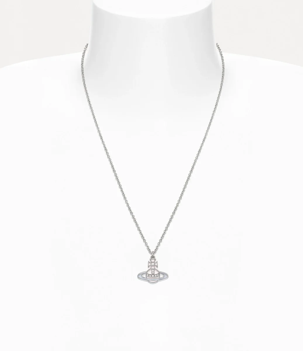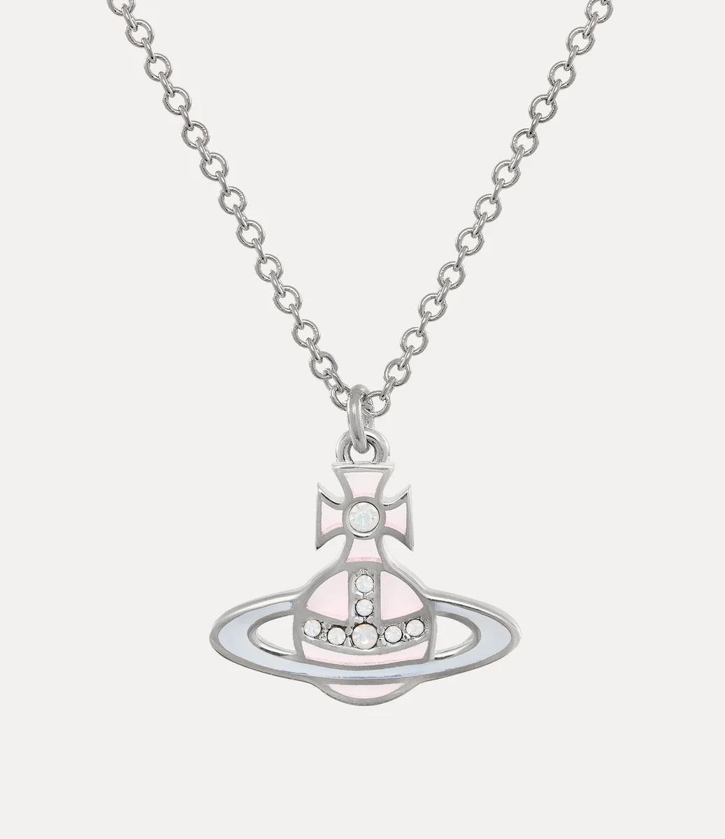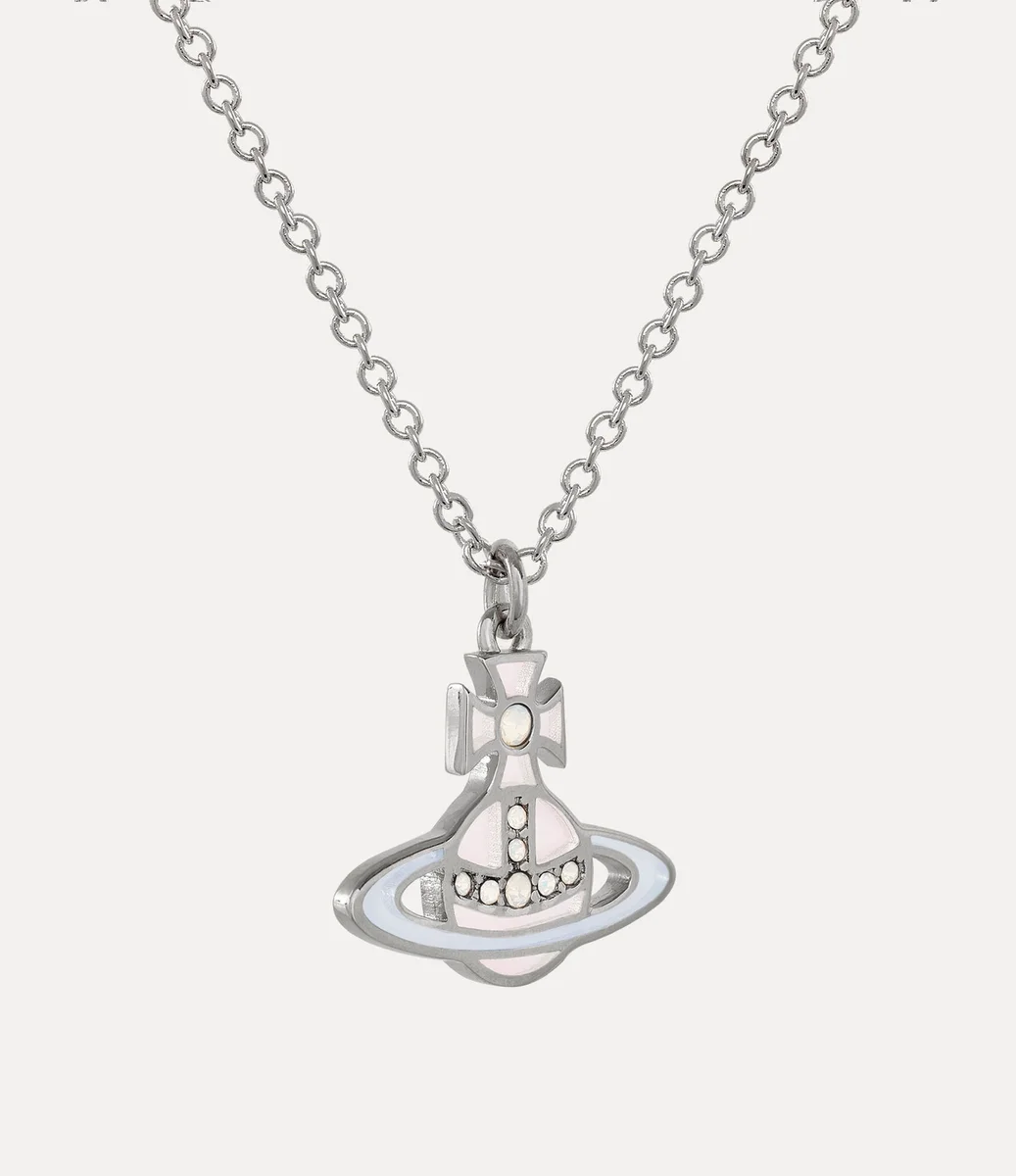 Die Kugelform des Hauses ist gleichbedeutend mit Viviennes Vision, Tradition in die Zukunft zu tragen. Die Man. Concetta-Anhänger-Halskette dieser Saison hat die Form der klassischen Kugel, die durch eine transluzente Emaille-Oberfläche und glitzernde Kristalldetails am Geschirr und am Kreuz oben ergänzt wird.