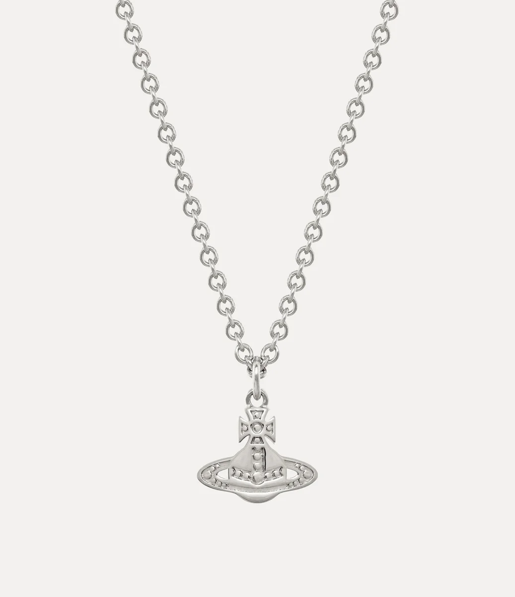 Unsere Man. Marinetta Anhänger-Halskette ist mit einem silberfarbenen Finish versehen und verfügt über unser charakteristisches Kugelmotiv, das an Viviennes Vision erinnert, Tradition in die Zukunft zu tragen. Der Anhänger hängt an einer polierten Trace-Kette und verfügt über eine gravierte Struktur auf dem Saturnring, der mit zarten Perlenakzenten verziert ist.