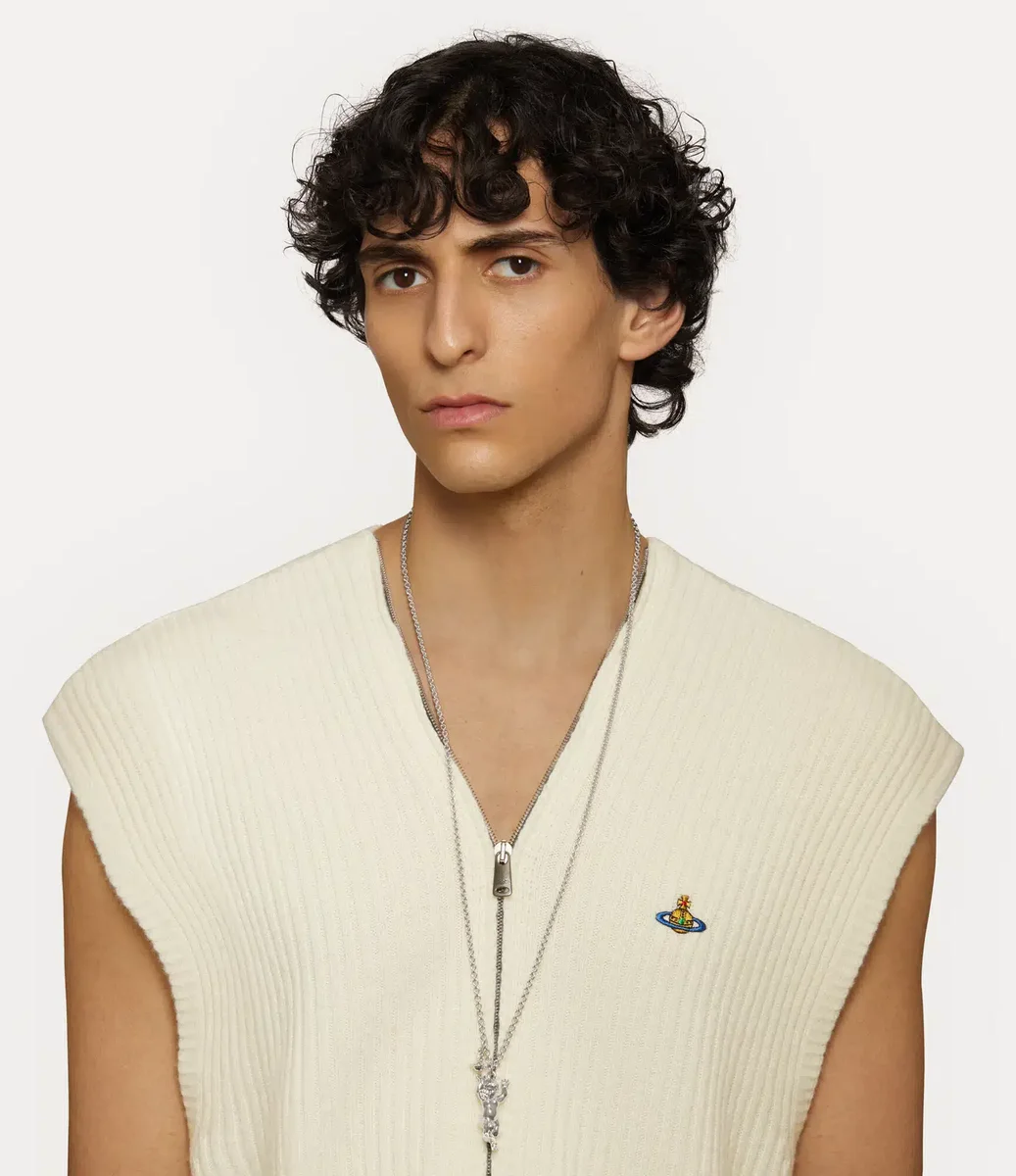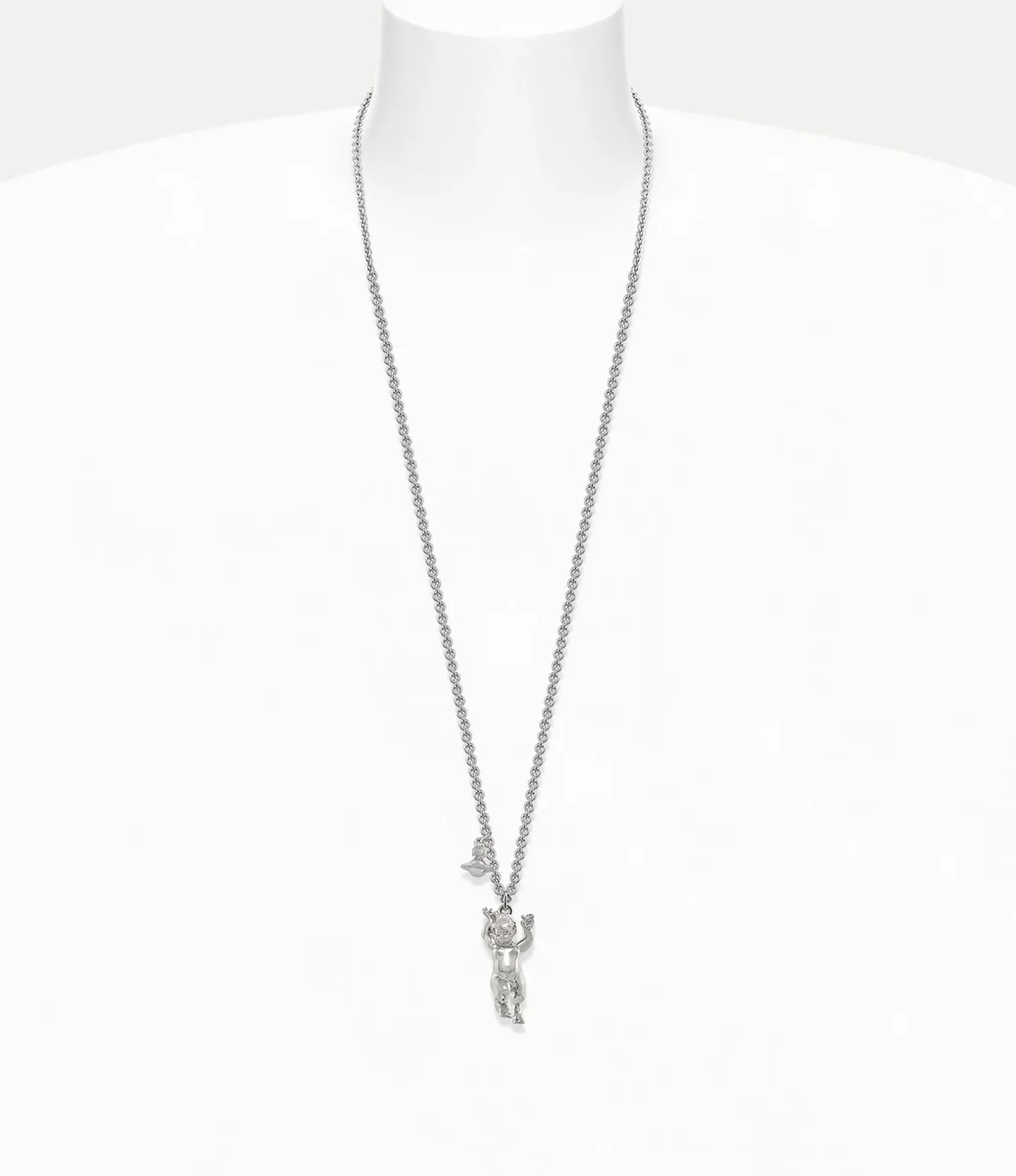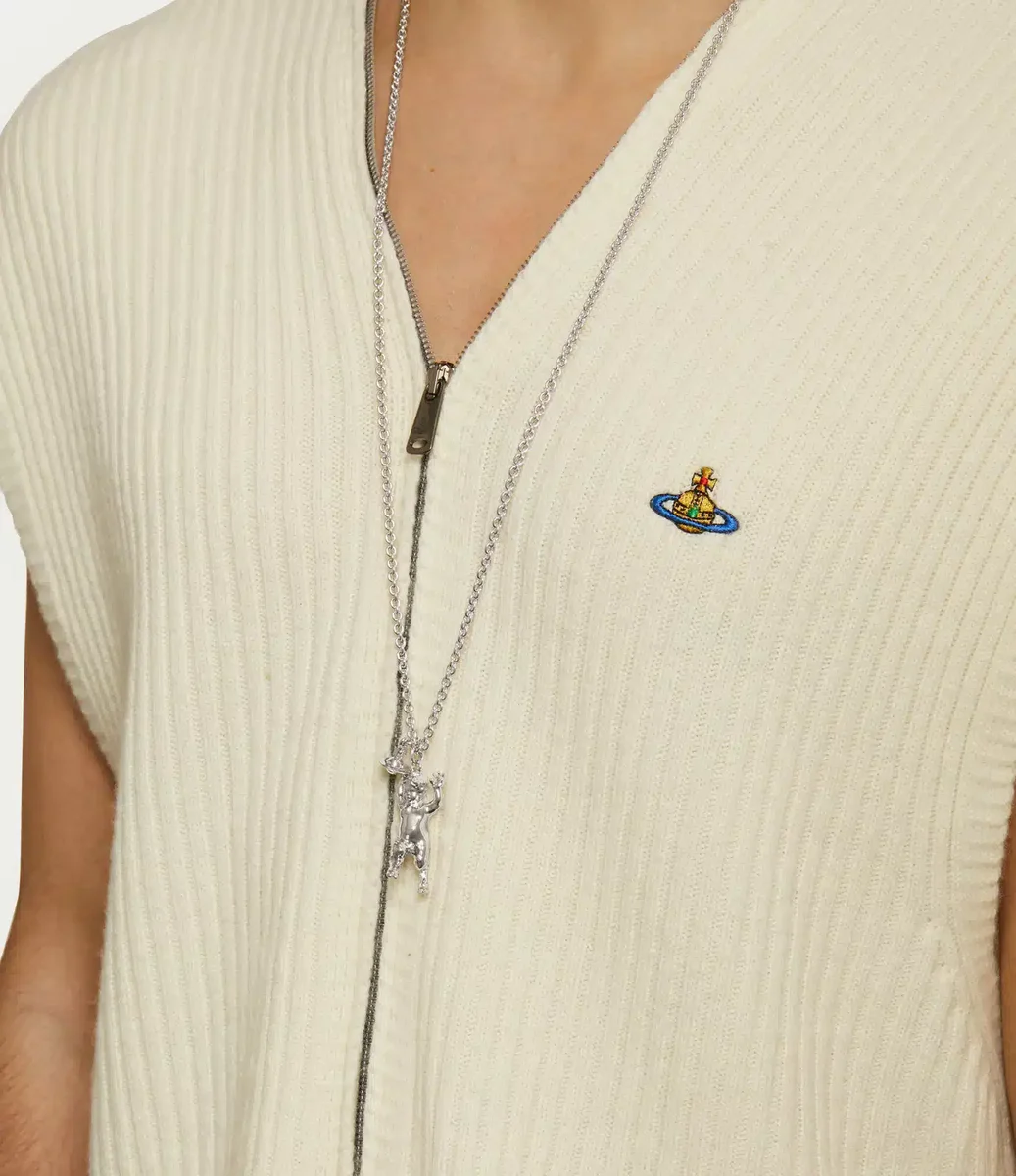 Die Man. Satyr-Anhänger-Halskette besticht durch ein auffälliges Satyr-Motiv in der Mitte, das eine Hommage an die traditionellen Designs aus Viviennes ikonischer „Britain Must Go Pagan”-Ära (1987–1990) darstellt. Das Stück ist mit einer silberfarbenen Beschichtung verziert und verfügt über unser charakteristisches Kugel-Motiv entlang der raffinierten Trace-Kette, das die Philosophie des Hauses verkörpert, die Vergangenheit in die Zukunft zu übertragen.