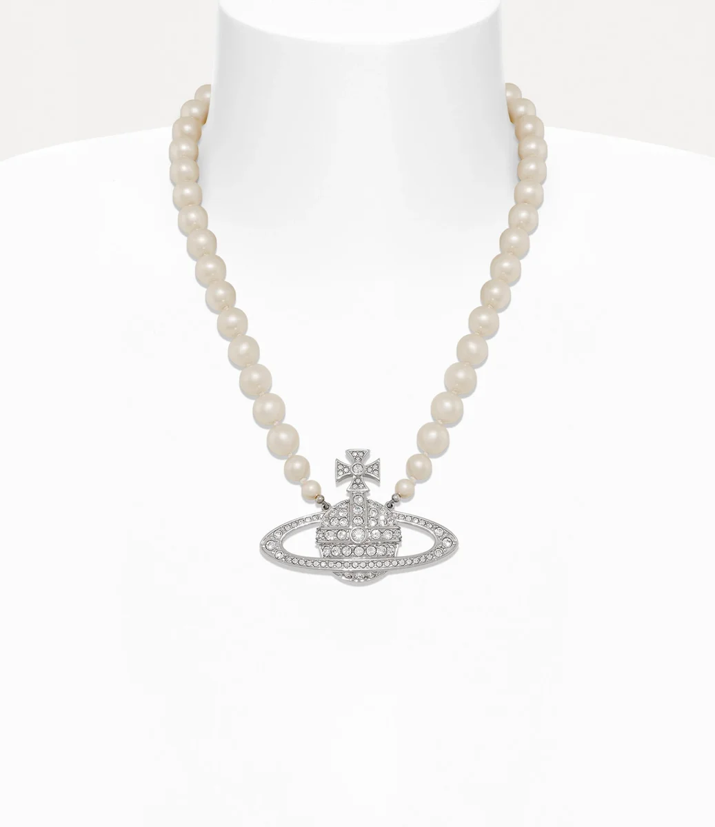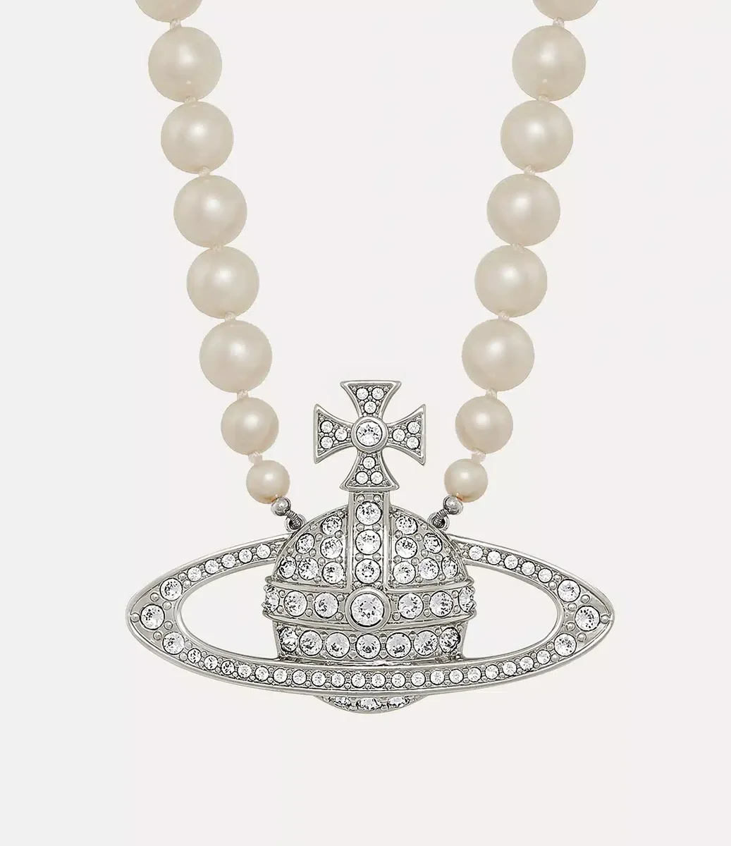 Perlen sind ein wesentlicher Bestandteil des Erbes des Hauses und vermitteln ein Gefühl von vergangenem Luxus. Unsere Man. Bas Relief Pearl Halskette zeigt eine Reihe handgeknüpfter Swarovski-Perlen, die elegant in ihrer Größe abgestuft sind, ergänzt durch ein mit Kristallen verziertes Kugelmotiv in der Mitte des Designs – ein Synonym für Viviennes Vision, Tradition in die Zukunft zu tragen.