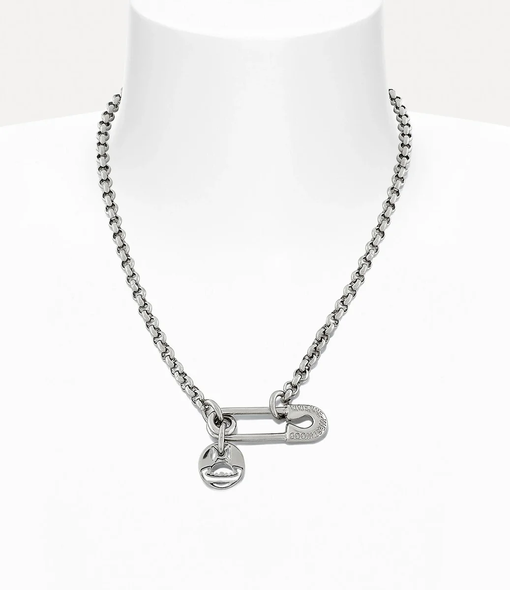 Die silberfarbene Halskette Man. Imogene verfügt über einen ausgeschnittenen Kugelanhänger, der am Ende eines gravierten Sicherheitsnadel-Anhängers hängt. Sie ist mit einer Belcher-Kette und einem Karabinerverschluss ausgestattet.