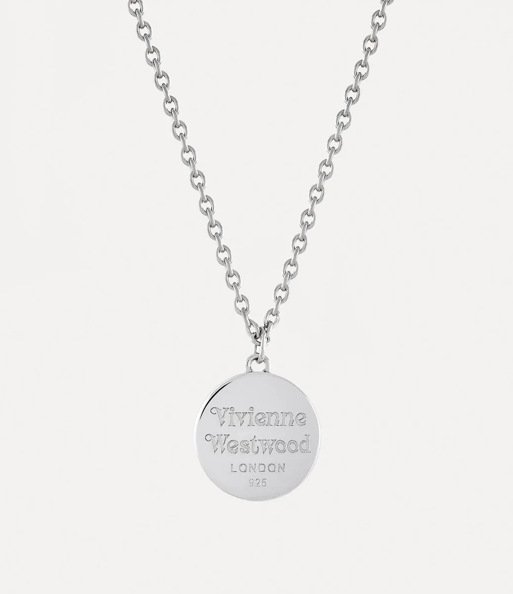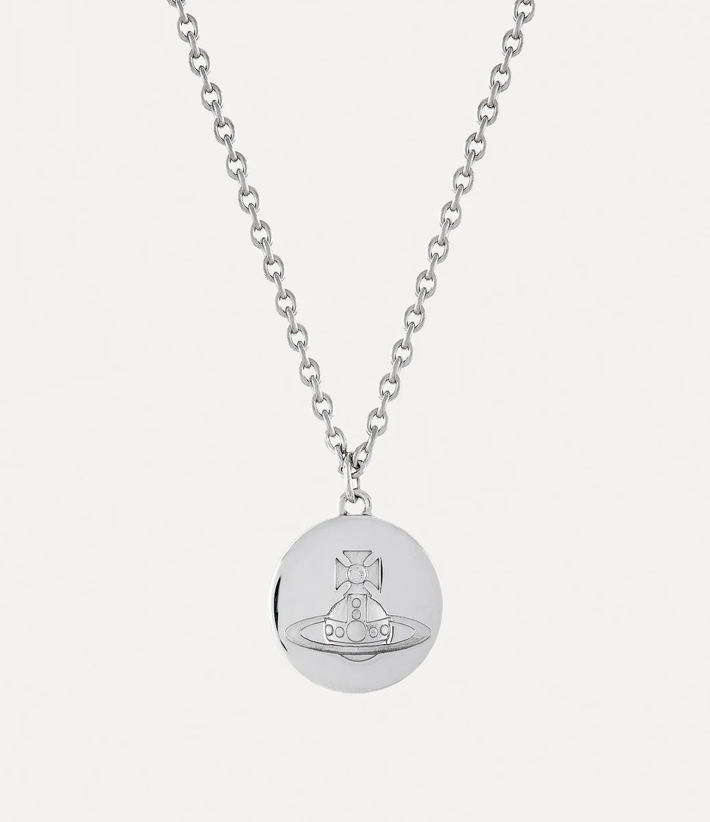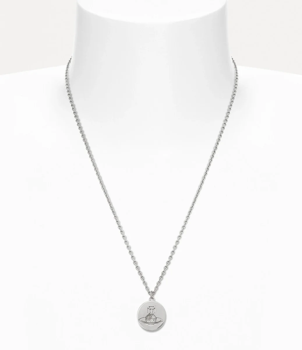 Die Man. Janus Anhänger-Halskette verfügt über eine platinbeschichtete Silberoberfläche und ist zu einer filigranen ovalen Silhouette geformt. Das Schmuckstück ist komplett aus Metall gefertigt und mit einem gravierten Schriftzug auf der Rückseite versehen, während die Vorderseite mit einem geprägten Globus verziert ist – ein Symbol für die Philosophie des Hauses, die Vergangenheit mit der Zukunft zu verbinden.