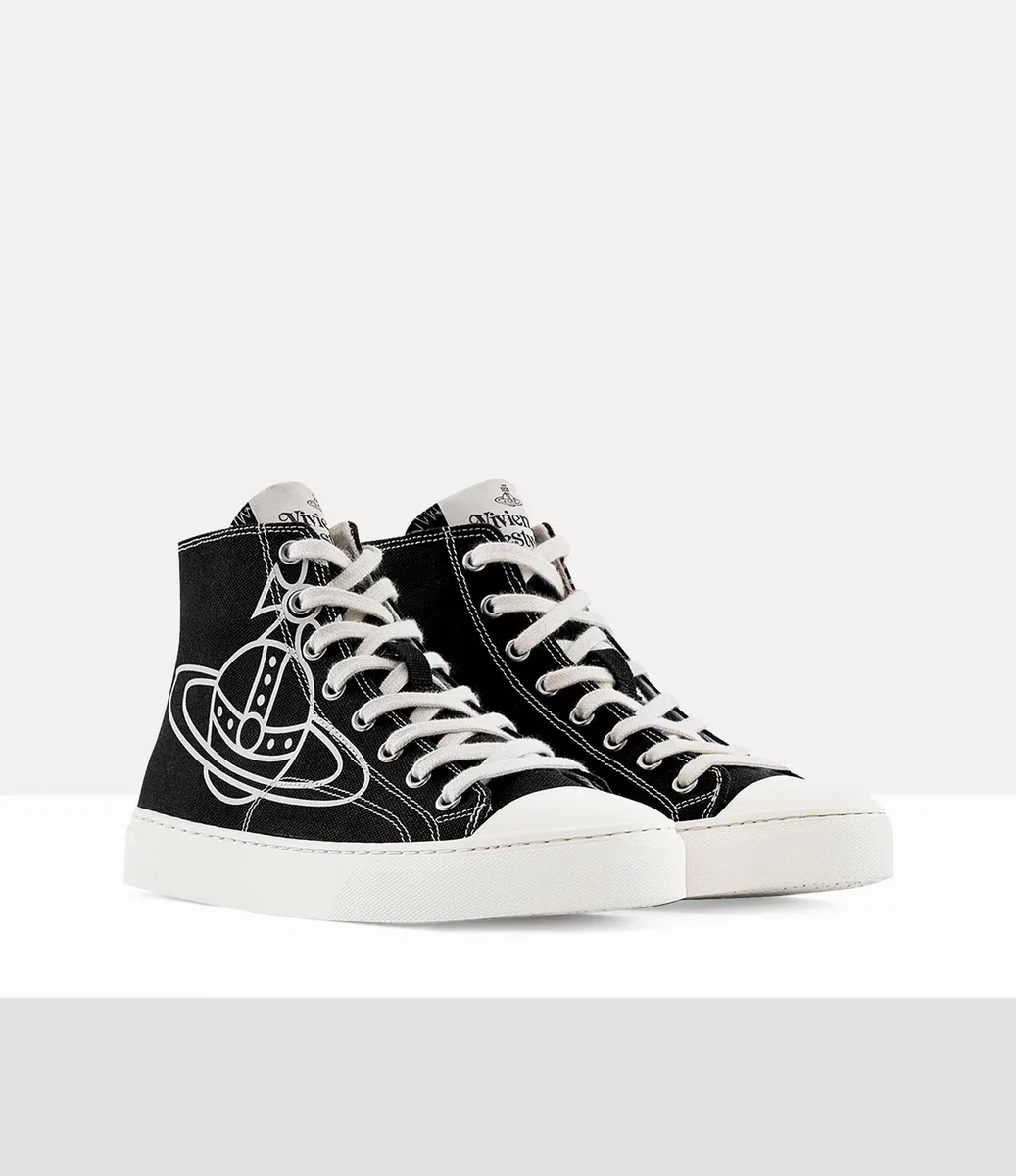 Die hohen Canvas-Turnschuhe von Vivienne Westwood sind mit dem historischen „Line Orb”-Motiv des Hauses verziert und mit einem gewebten Label auf der Zunge versehen.